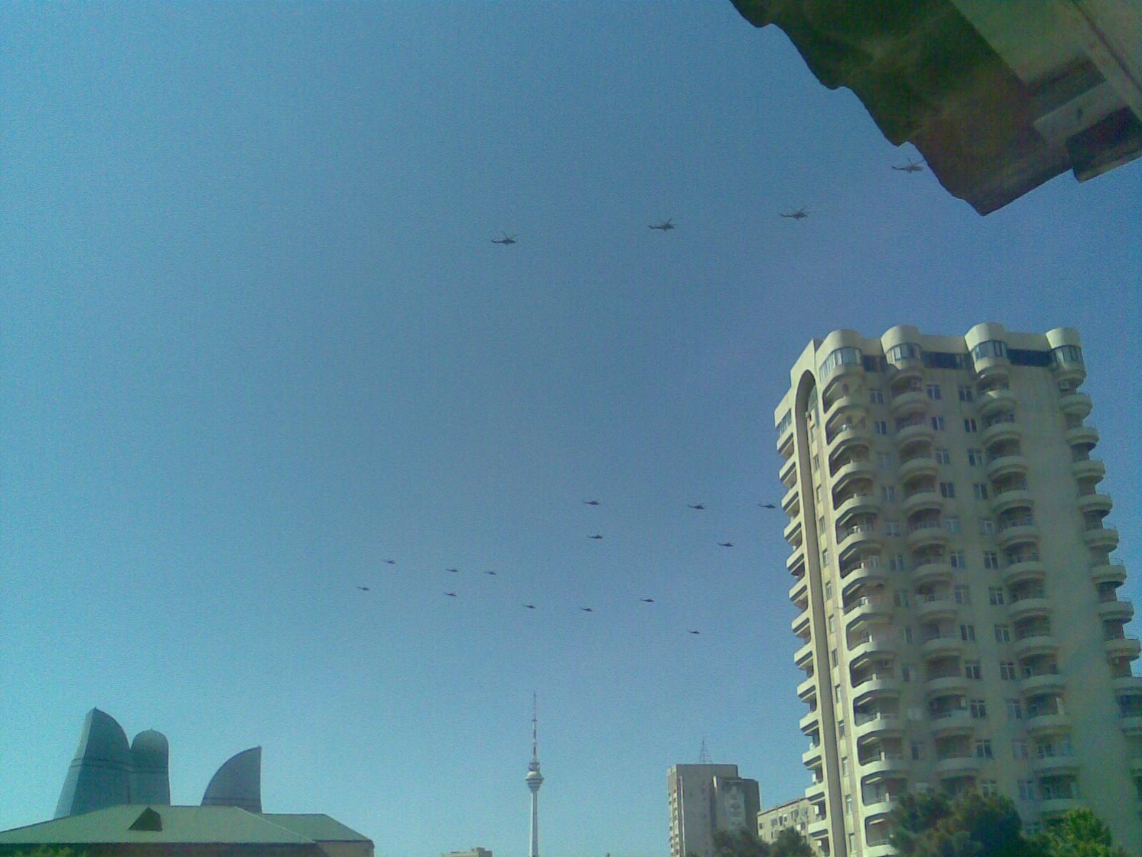Утром над моим домом пролетели эскадрильями различного типа самолеты и вертолеты военной авиации Азербайджана. Летчики готовятся к военному параду в День вооруженных сил 26 июня.