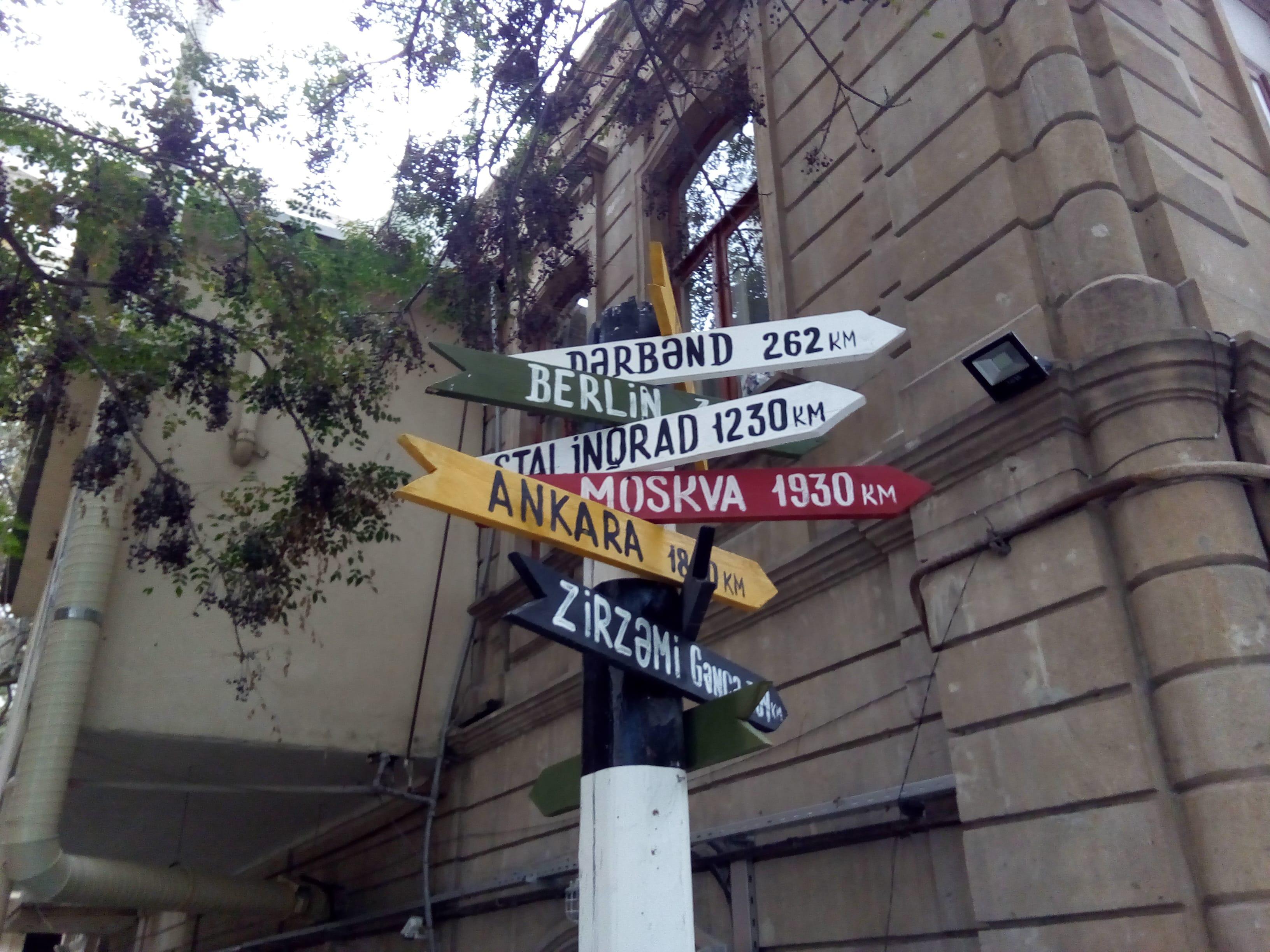 Новый указатель мировых направлений. Среди стрелок - азербайджанский Тебриз (город в Иране), второй город в Азербайджане - Гянджа, тот самый ночной бар ради которого стоит указатель, окровавленный Ходжалы. Правильно, надо напоминать о зверствах древнейших при каждом случае. [...]