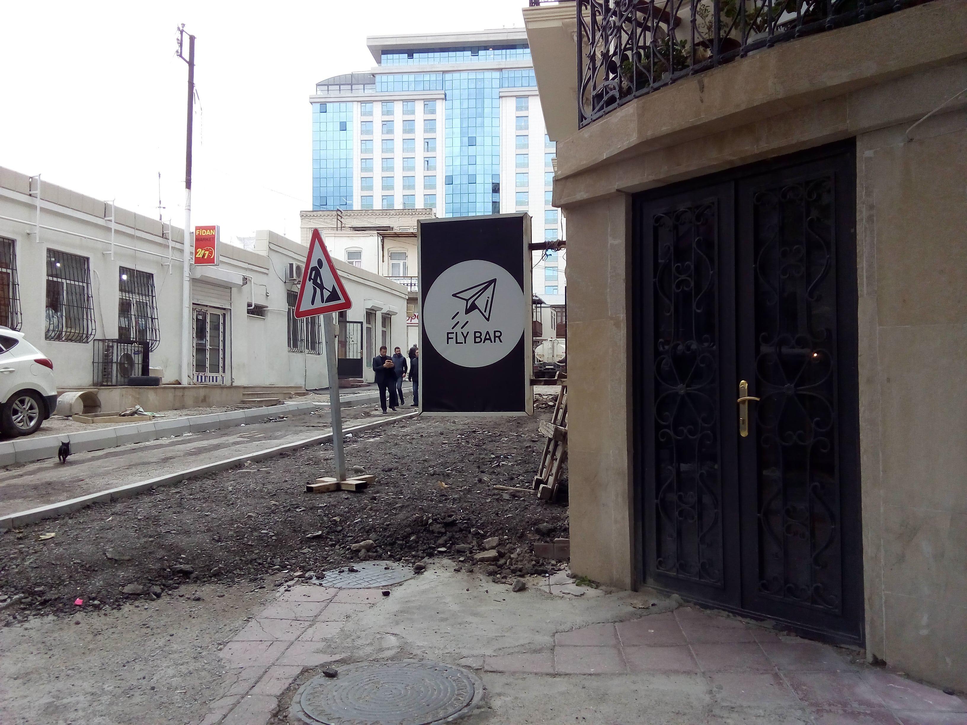 Обратите внимание на рекламку слева: Дринкс и закуски. В Баку могут говорить одновременно на трех языках. Вниманию президента, подписавшего указ заботу об азербайджанском языке