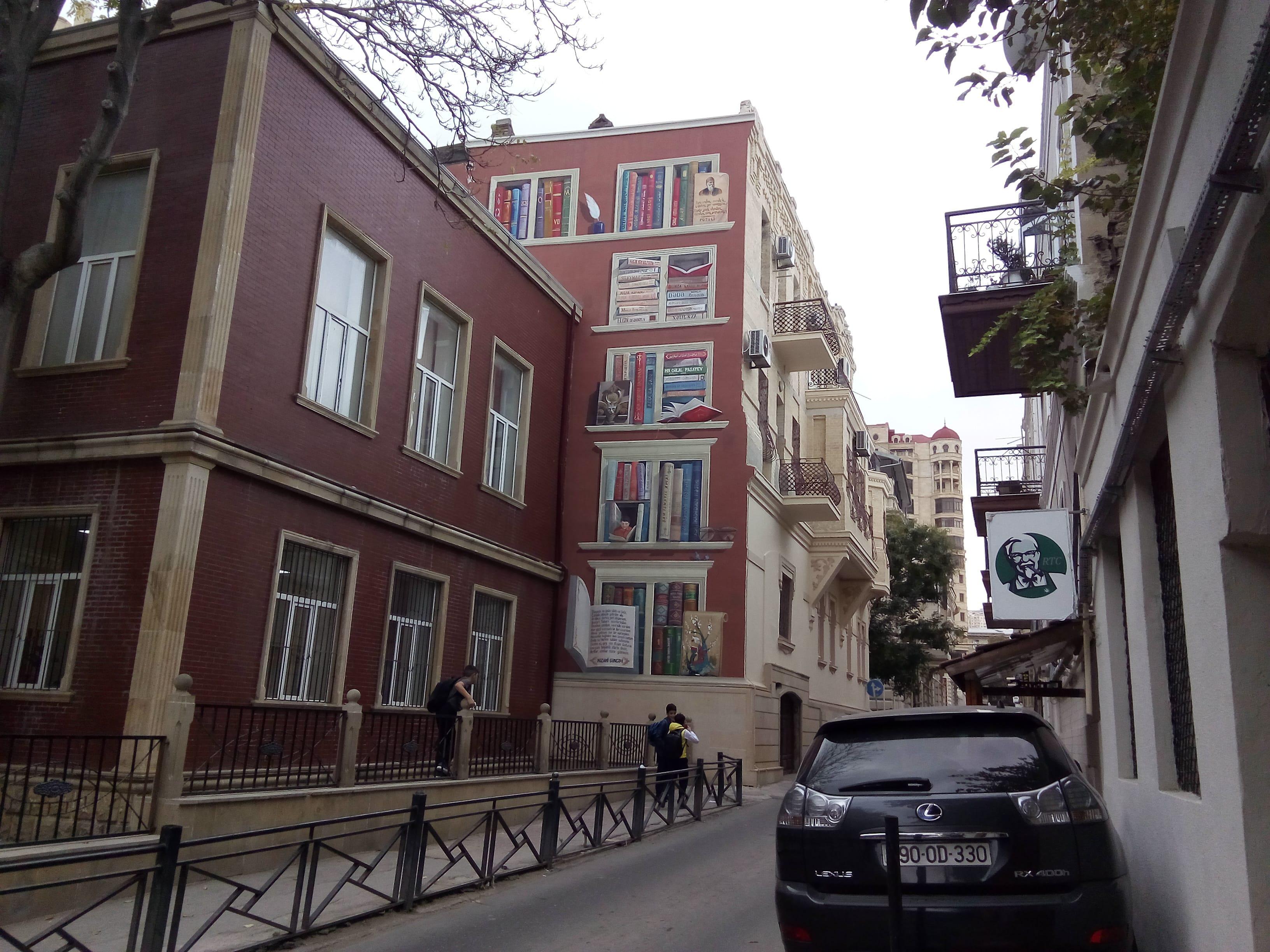 Так, теперь самое трудное - объяснить. Среди моих читателей есть отъявленные умники в кавычках, которые спрашивают есть в Азербайджане театр и думают, что сразили остроумием наповал. Объясняю для них: это гигантский книжный шкаф для великанов, могут зайти и выбрать понравившуюся книгу. Ну уникальный наш город, что поделаешь. Нигде такого шкафа нет, только в Баку.