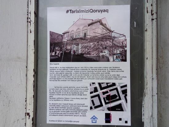 Отношение государства к историческим зданиям в стране - имеющим и не имеющим особый статус, должно быть пересмотрено с ужесточением наказания за незаконные разрушения этих объектов. Гражданское общество активно реагирует на массовое уничтожение азербайджанской архитектурной истории, что обнаружилось после известия о строительных работах в заповеднике "Ичери Шехер" и бывшем молельном доме бакинских молокан. Распространяемое в социальных сетях недовольство общественности принимается властью к рассмотрению, она же выдает успокаивающие граждан заявления.
