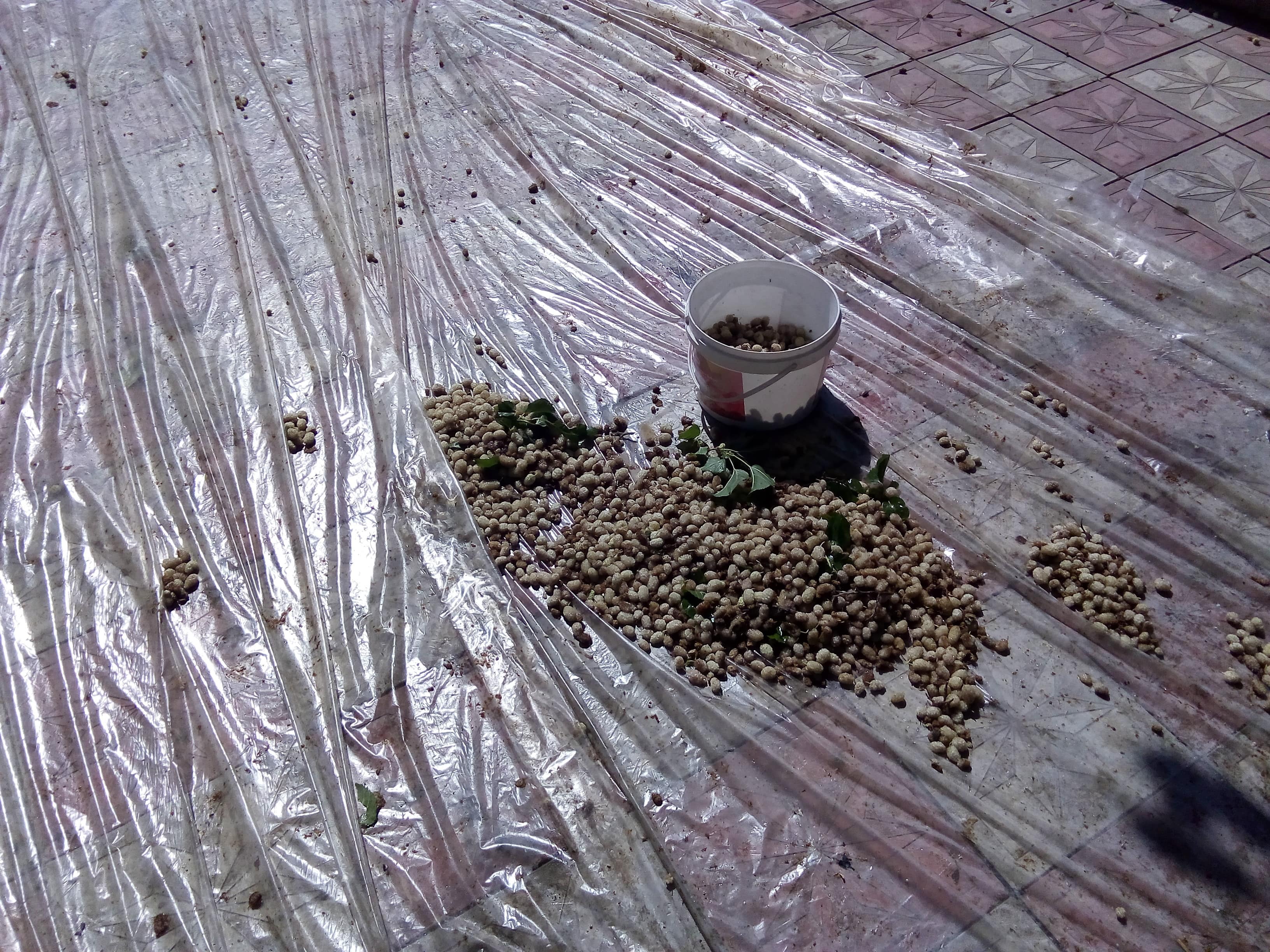 Вначале длинной палкой сбивал ягоды с веток на постеленный на земле пластик.
