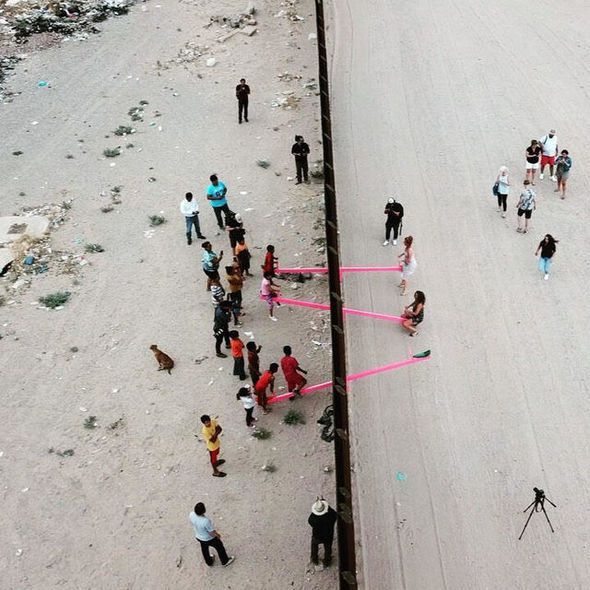 На глаза попались две эти фотографии. Кто-то в США или Мексике построил простые качели на стене, разграничивающей две эти страны. Просунул розовые доски на имеющиеся перекладины и получились качели. Образ мира и добрососедства. Умилительная символика.