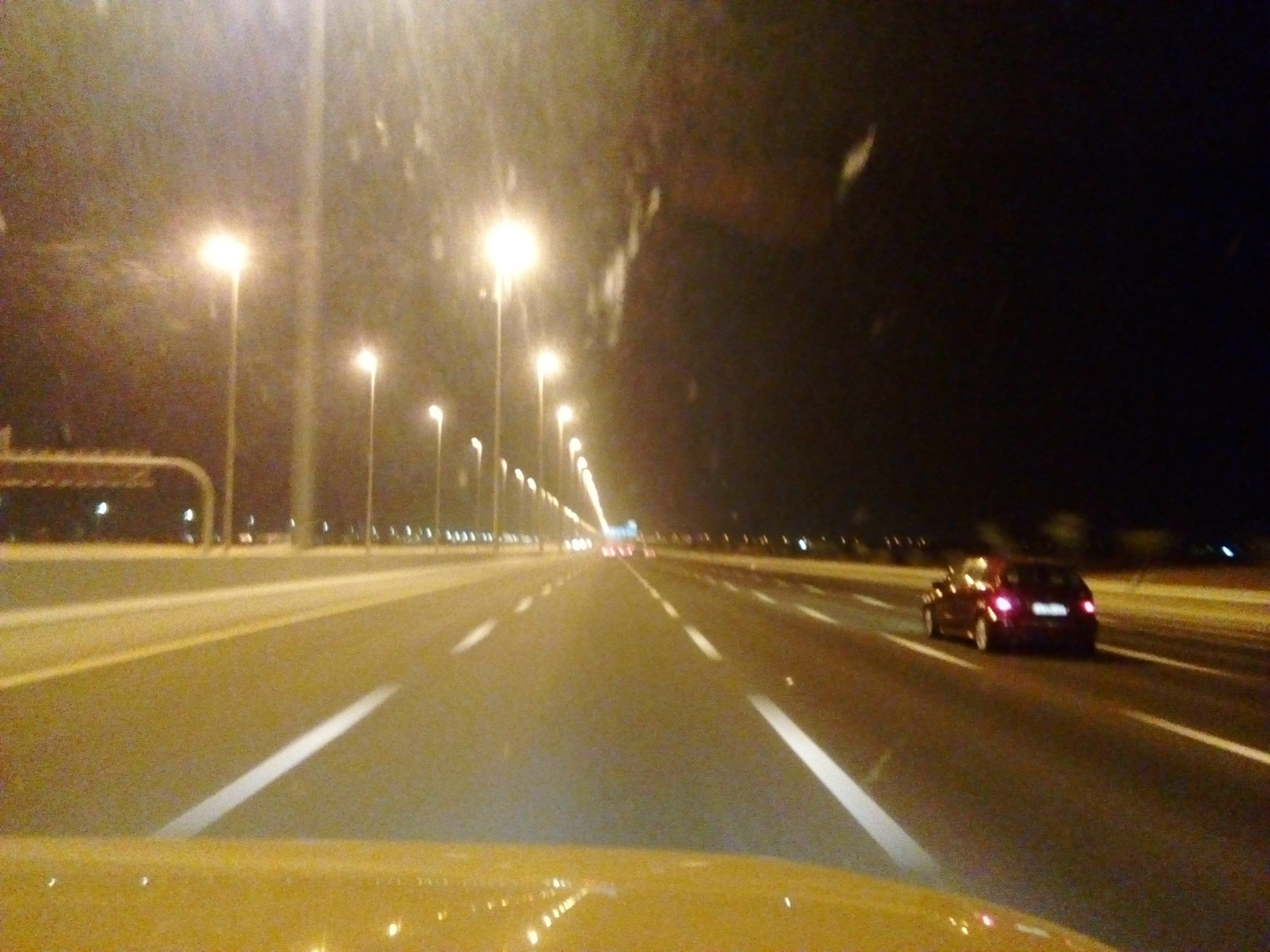 В Катаре денег так много, что они не знают экономии. Все трассы в городах и между обязательно освещены частыми и очень высокими столбами - как на этом фото. Посмотрите и найдите хоть одну не горящую лампу.