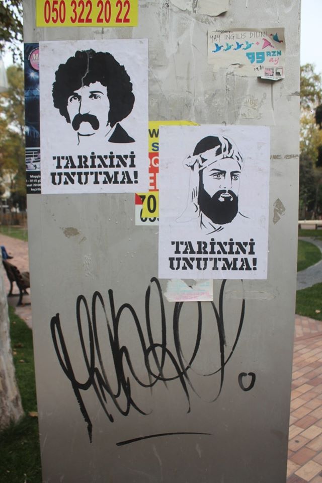 Под изображениями джазового пианиста Вагифа Мустафазаде и поэта-мыслителя Низами подписано: "не забывай историю!"