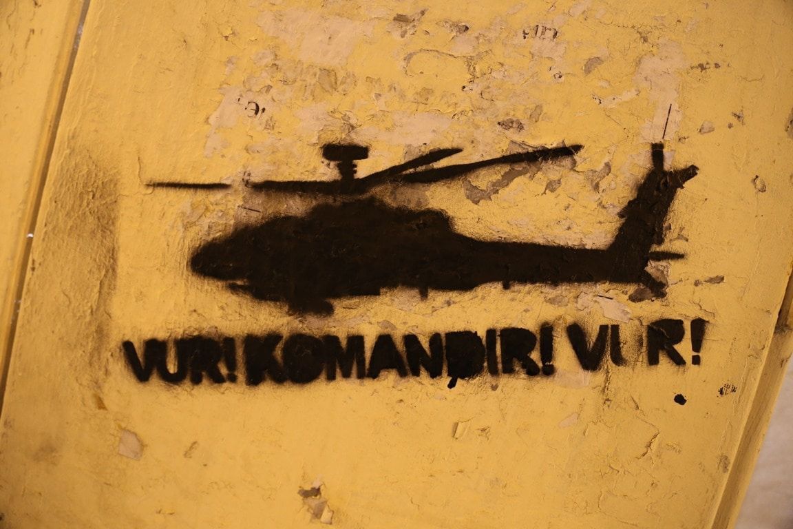 Из представленных творений мне единственно и безоговорочно нравится картина "Вур, командир, вур" с изображением вертолета. На ней изображен сбитый азербайджанским воином армянский боевой вертолет, и написан ставший мемом клич солдата, обращенный к стрелявшему прапорщику: "бей, командир, бей"!