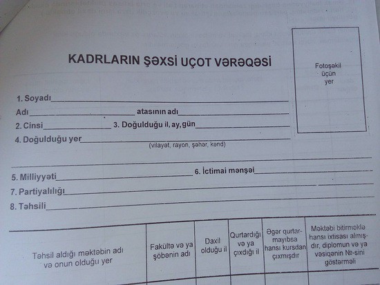 Мое расследование выявило, что граждане покупают эти бланки в обычных газетных киосках, заполняют и сдают в кадровые отделы многих учреждений - не только в Академию Наук. Там принимают и не удивляются вопросам, хотя в инструкции к кадровой службе, как мне сказал руководитель отдела кадров НАНА, требования о перечисленных вопросах нет. Тогда почему такие бланки, заполненные гражданами, принимаются кадровиками? Почему президент НАНА не займется таким советским анахронизмом, не потребует использования вопросника исключительно с вопросами, перечисленными в современной инструкции?
