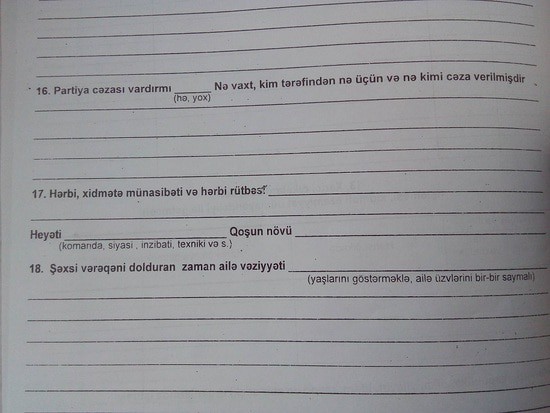 Молодой магистр (выпускник университета) показал мне пустой бланк кадровиков Национальной Академии Наук Азербайджана (НАНА), который необходимо заполнить всем, поступающим в докторантуру, на работу в НАНА и др. В бланке надо ответить на вопросы о: национальности, партийности, наличии партийных наказаний, службе в партизанских отрядах. Есть другие вопросы, которые могут иметь смысл - о службе в армии, роде войск (предположим, ответы нужны на случай войны). А как с партийностью, национальностью, партизанщиной? Если в удостоверении личности граждан Азербайджана эти данные не указываются, какое дело Академии Наук до личных, врожденных национальных и политических особенностей ученых? Понимаю, что бланк спокойно перекочевал в современность из Советского Союза. Зачем? Руководству НАНА не приходит в голову задаться этим вопросом? Президенту НАНА Рамизу Мехтиеву важно знать в каких партизанских отрядах служили ученые?