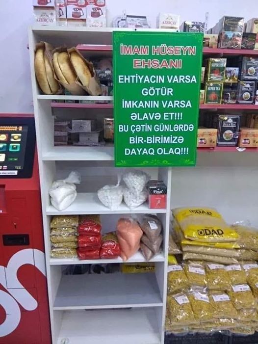 Есть другой способ помощи ближнему по азербайджански. На фото стенд в бакинском магазине, на нем написано: если неимущий, тогда бери бесплатно, если имущий - помоги другому. Был бы я в этом магазине оплатил бы благотворительные продукты обязательно.