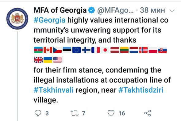 Министерство иностранных дел (МИД) Грузии выразило благодарность Азербайджану за поддержку территориальной целостности Грузии и осуждение незаконных работ по ограждению, проводимых недалеко от села Тахтидзири оккупированного района Цхинвали. В связи с этим МИД Грузии опубликовал пост в "Twitter". "Грузия высоко оценивает нерушимую поддержку международной общественности своей территориальной целостности и выражает признательность за осуждение незаконных работ по ограждению, проводимых недалеко от села Тахтидзири, являющегося зоной оккупации района Цхинвали", - говорится в сообщении.