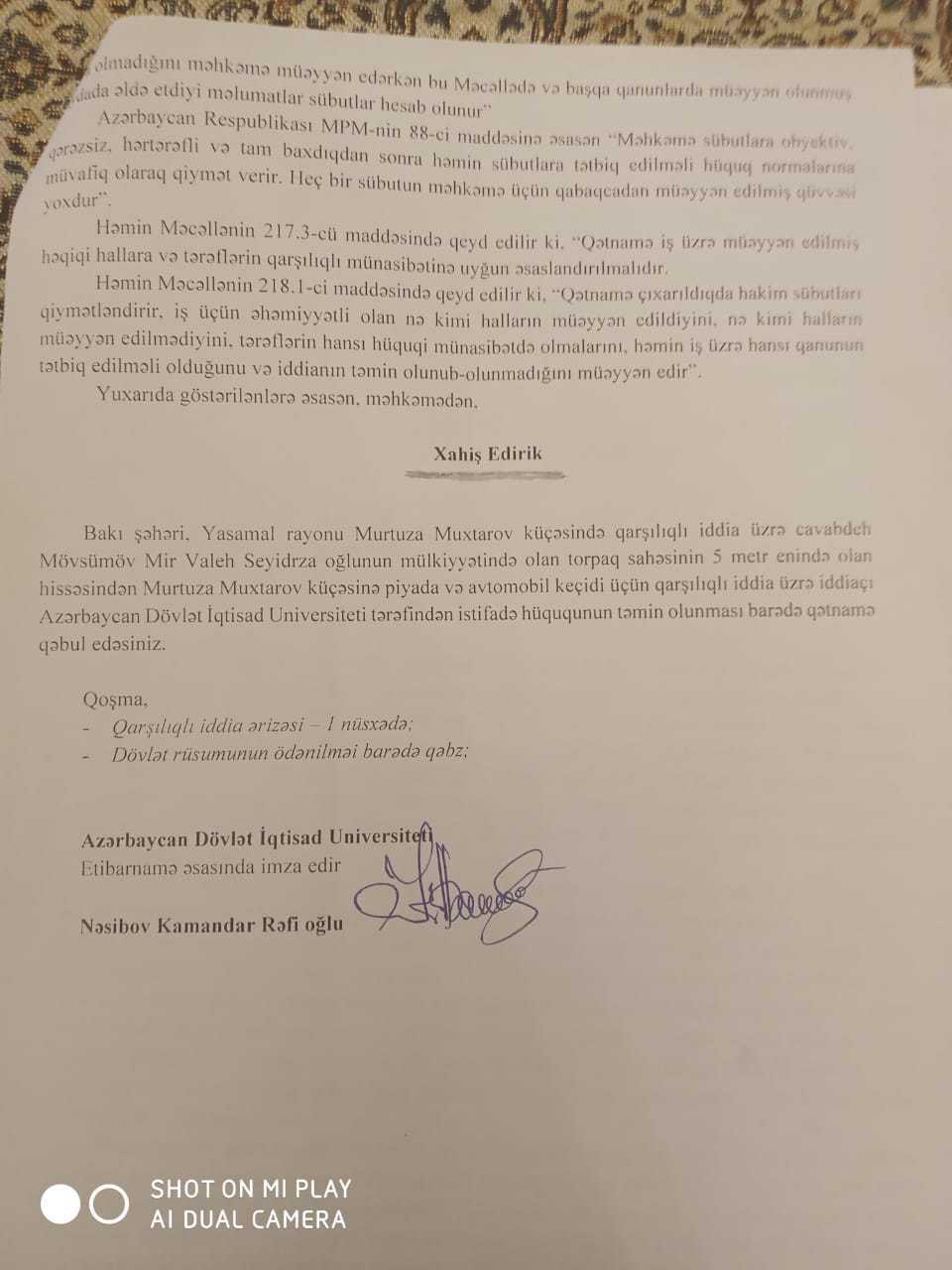 Жалоба Мовсумова рассматривается в суде Ясамальского района ( судья Халилова Тахмина ), но Экономический университет "занят делом", по земле Мовсумова сейчас прокладывается бетонная дорога