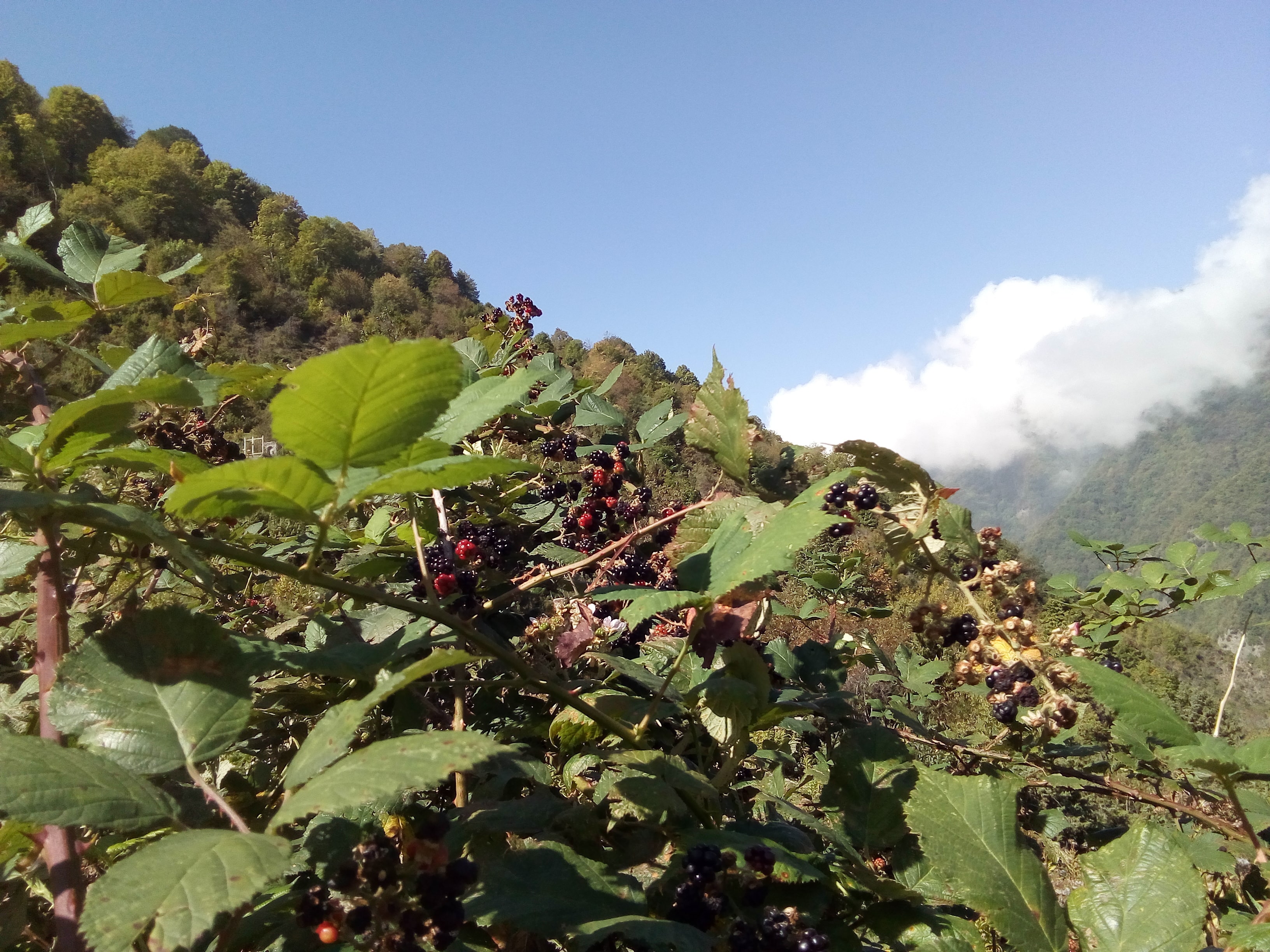Ежевика в колючих кустах. Колючки направлены в сторону куста, так что если вцепятся тянут к себе. Много не соберешь под солнцем, руки царапают. Но селяне несколько ведер за лето заготавливают для вареньня