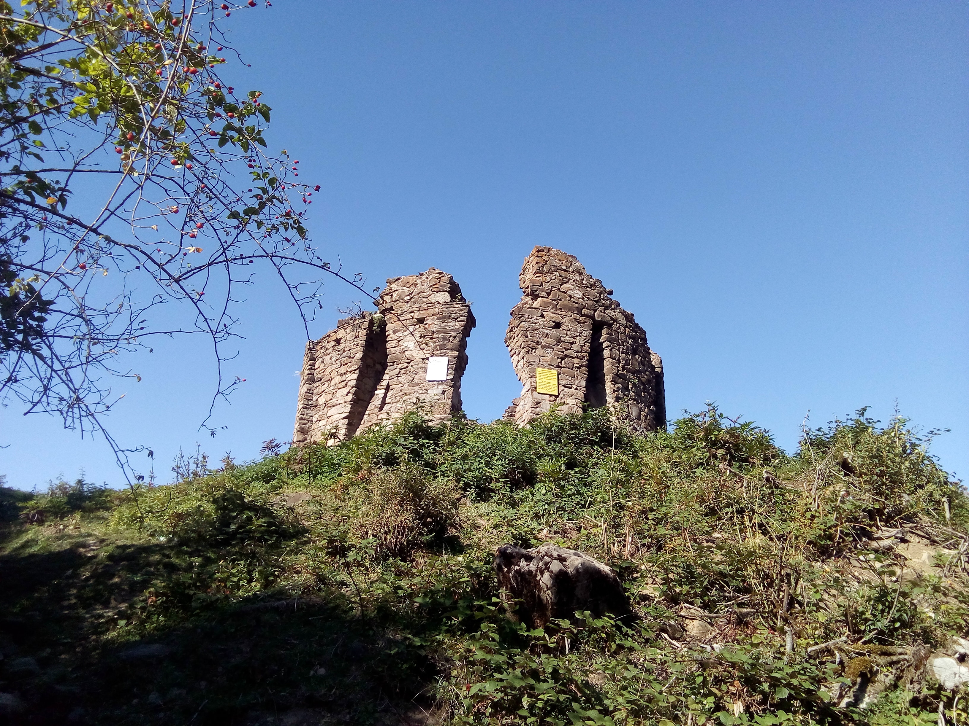 Башня Галача. Камни затаскивали на гору на ослах, цемент не использовался. В башне несли караул русские солдаты, обозревая дорогу с Севера Кавказа, откуда могли прийти отряды Шамиля. Башня якобы под охраной государства, об этом сообщают таблички. Но козлообразные туристы залезают на стены чтобы снять фото, и башня постепенно разрушается. Снег, ветер, дождь тоже делают свое дело