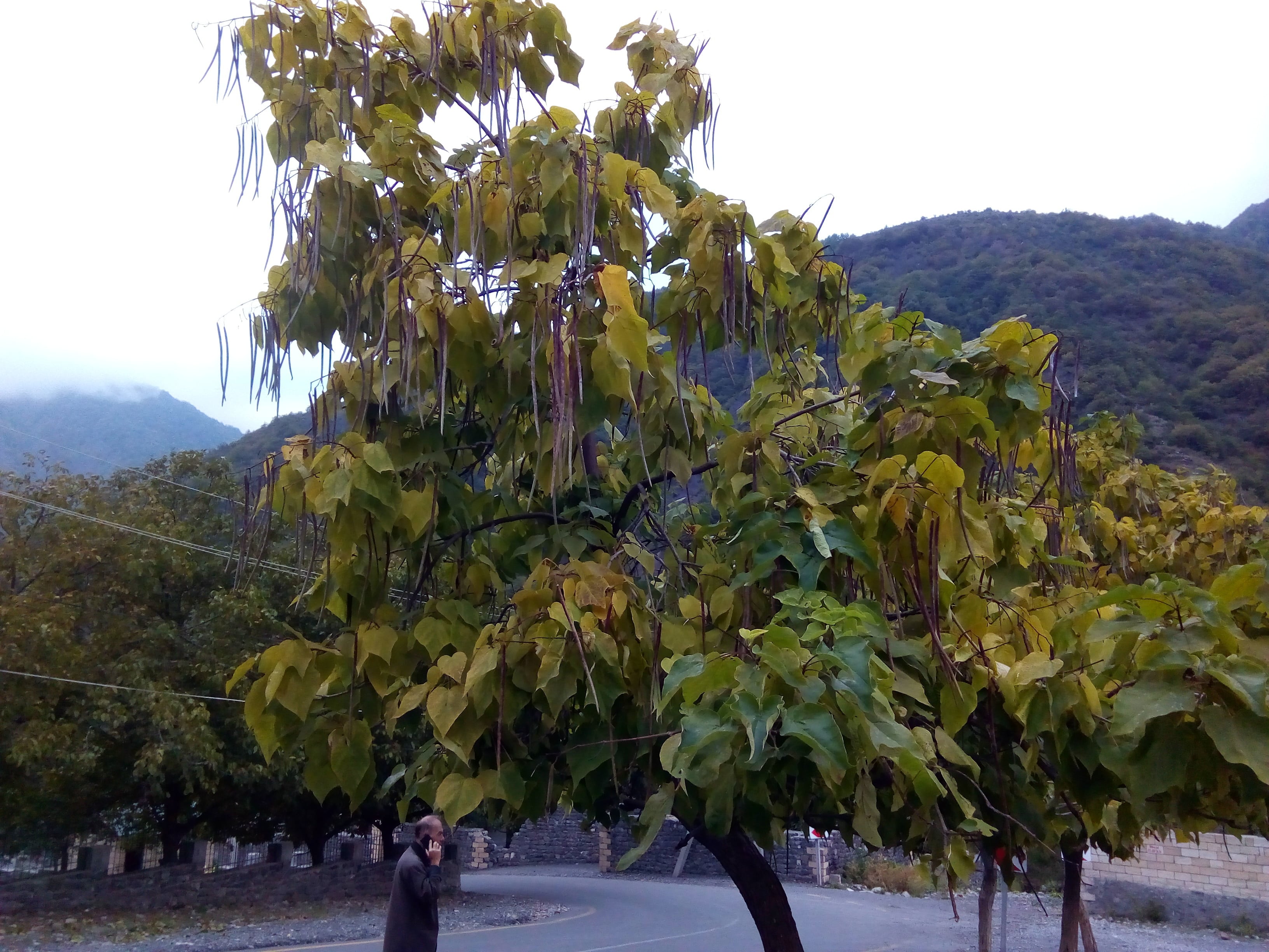 Это дерево не знаю как называется, впервые заметил. Красиво свисают длинные стручки, внутри семена. Выглядит по китайски.