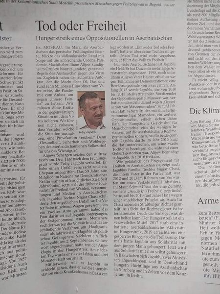 Общегерманская газета "Frankfurter Allgemeine Zeitung für Deutschland" опубликовала материал под заголовком "Смерть или Свобода". В материала сообщается о жизненном пути азербайджанского политика Тофика Ягублу, 18-е сутки проводящего голодовку в Баку, его семье, причине протеста Ягублу и отношении к нему азербайджанской власти.