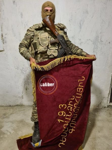 На этом снимке видите нашего бойца, стоящего на захваченном знамени 193-го десантно-штурмового батальона ВС Армении. Это второе боевое знамя, брошенное к ногам азербайджанской армии. Вы скажете - боец не уважает знамя врага. А я отвечу - нельзя уважать армию которая целенаправленно бомбит гражданские населенные пункты. Она - не армия, банда убийц бросающая свои символы на дорогах по которым бежит.