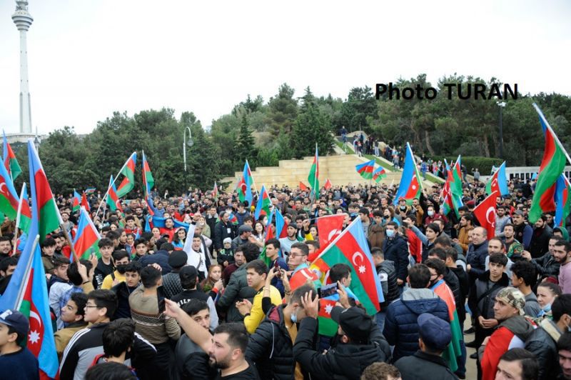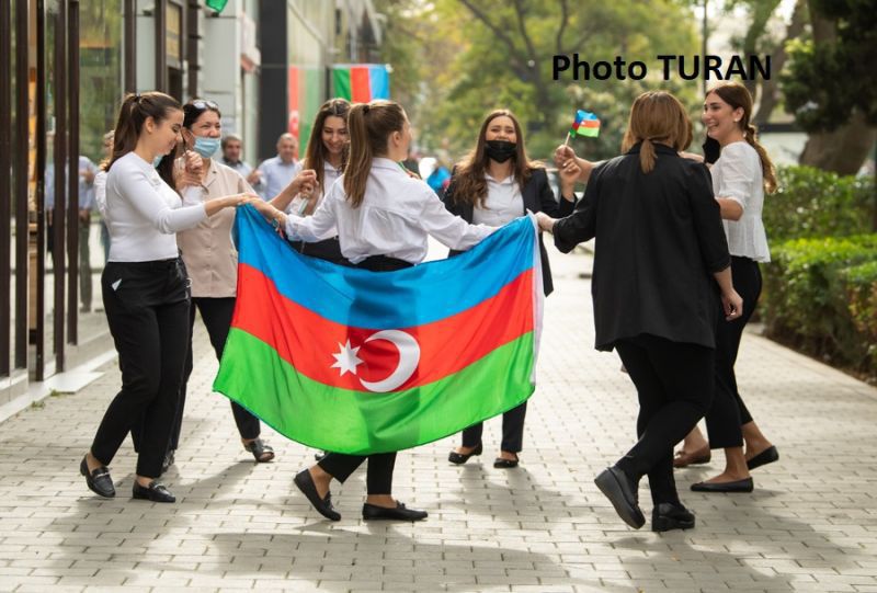Сегодня такой день. В Баку гигантское количество молодежи танцует, гоняет на автомобилях с развевающимися флагами, демонстрирует плакаты [...], распевают мейхана - восточные частушки, в которых высмеиваются бежавшие с поля боя [...] и опять в куплетах повторяется комичное имя бородатого [...].
