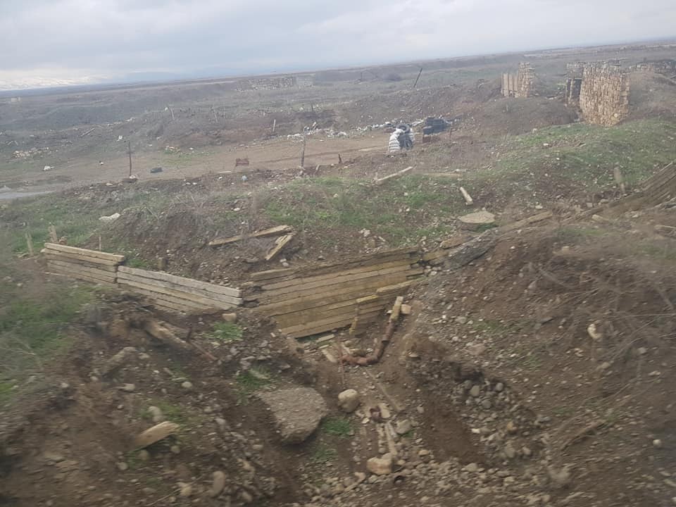 На первой полосе протянуты в несколько рядов колючие проволоки, там же очевидно, минные поля карты которых Ереван отказывается Азербайджану предоставлять. Далее на несколько километров вдоль дороги огневые точки для отдельных солдат, устроенные из камней на валу высотой больше роста человека. За этой линии советский асфальт, после асфальта второй такой же насыпной вал с огневыми точками. После второго вала вторая, грунтовая дорога для срочной переброски войск.