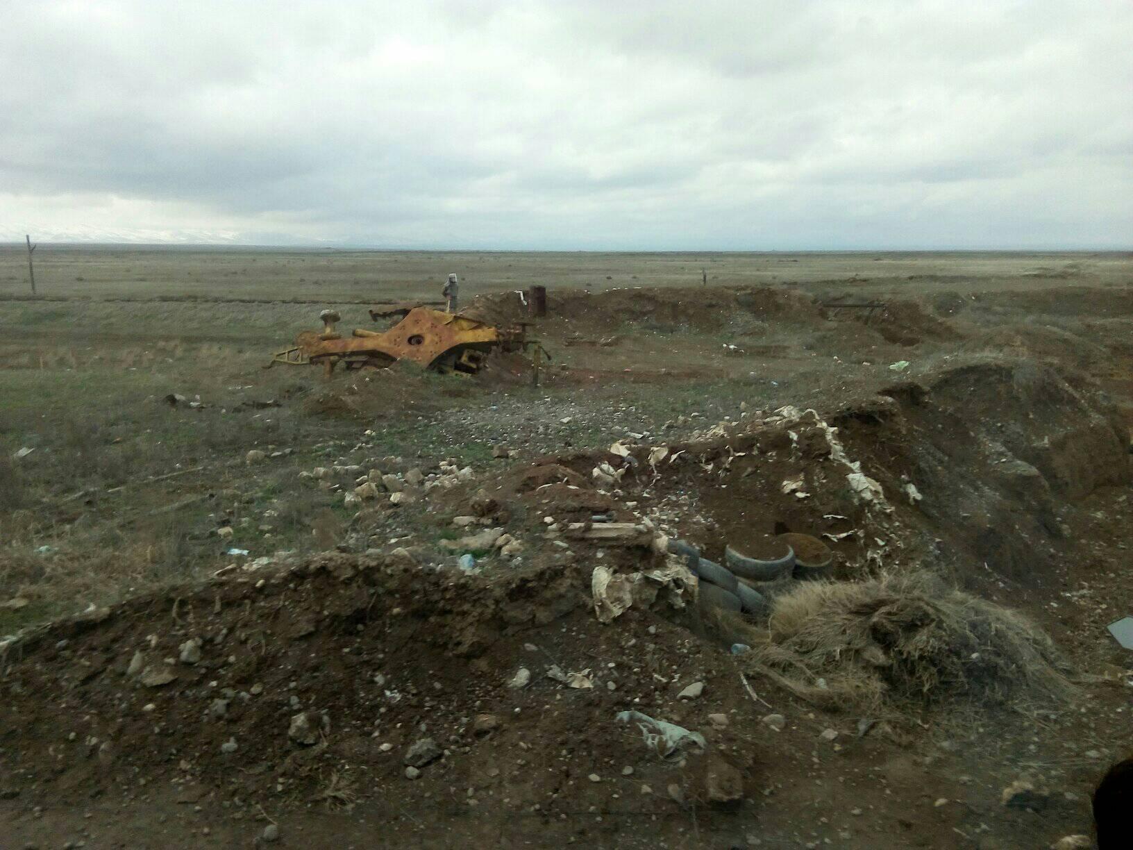 У первого азербайджанского военного поста - это насыпной высокий холм с выложенным пиленым камнем и защищенным автошинами ДОТом («долговременная оборонительная точка») — отдельное малое капитальное фортификационное сооружение из прочных материалов, предназначенное для долговременной обороны и стрельбы различными огневыми средствами из защищённого помещения), подразделение минеров развернулось для демонстрации своей работы.