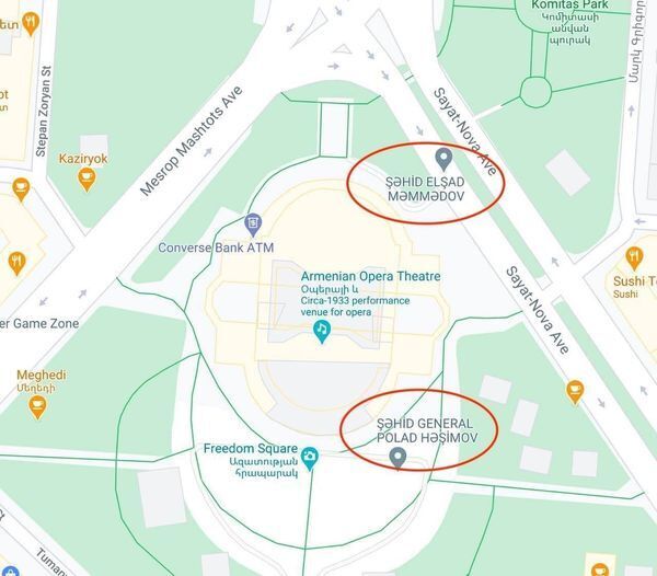 А теперь читайте не фэнтези, а реальный случай который сегодня в первую половину дня был. Может и сейчас продолжается, не смотрел Google Map - интернет карту Еревана. На ней рядом с зданием Ереванского оперного театра, две улицы названы в честь героев ВС Азербайджана генерала Полада Гашимова и солдата Эльшада Мамедова.