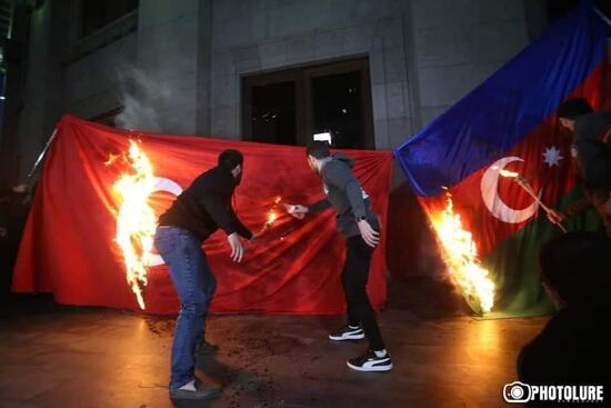 В ноябре прошлого года [...], когда их "непобедимая и героическая" армия ушла с захваченных в 92-93 годах территорий, сжигали свои дома на азербайджанской земле, расстреливали животных и вырубали наши леса. Вчера они сжигали в Ереване турецкие и азербайджанские флаги. Эти [...] уверенным шагом идут к следующей своей национальной катастрофе. Все в современном мире убыстряется. Если первые две национальные катастрофы у них произошли почти с 100 летним интервалом, то третья будет скорее, уж больно [...] торопятся. С такой скоростью на создание новой "неподемой" армии у них времени не будет