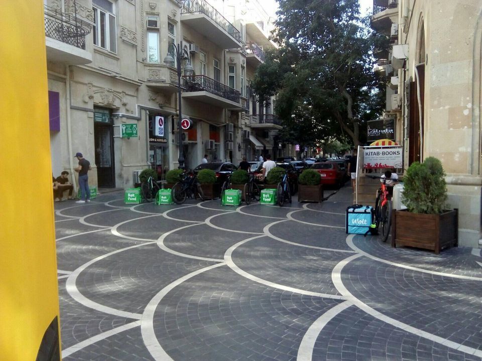 На этом фото , на мостовой выставлены велосипеды и сумки для транспортировки горячей еды. Где-то рядом сидят разносчики