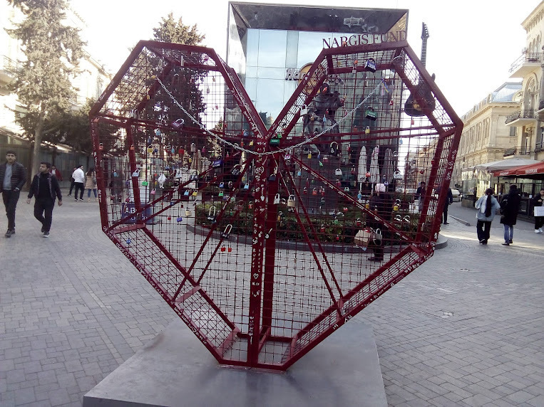 Красную металлоконструкцию не понял - см. фото. К ней подвешено множество замочков. Явно задумка перенята в других городах, где к перилам мостов влюбленные приковывают замочки, типа они так любовь свою запирают навечно, чтобы с другими не сношалось. Металлическое сердце установил фонд Наргиз. Я бы этой Наргиз советовал заняться более полезным делом.