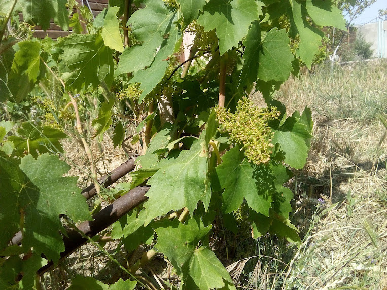 Виноград поспеет через месяц-полтора, но уже видно, что сорт кишмиши в этом году даст 2-3 ведра мелкого винограда без косточек.