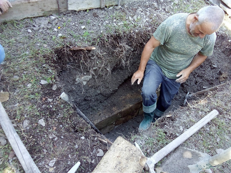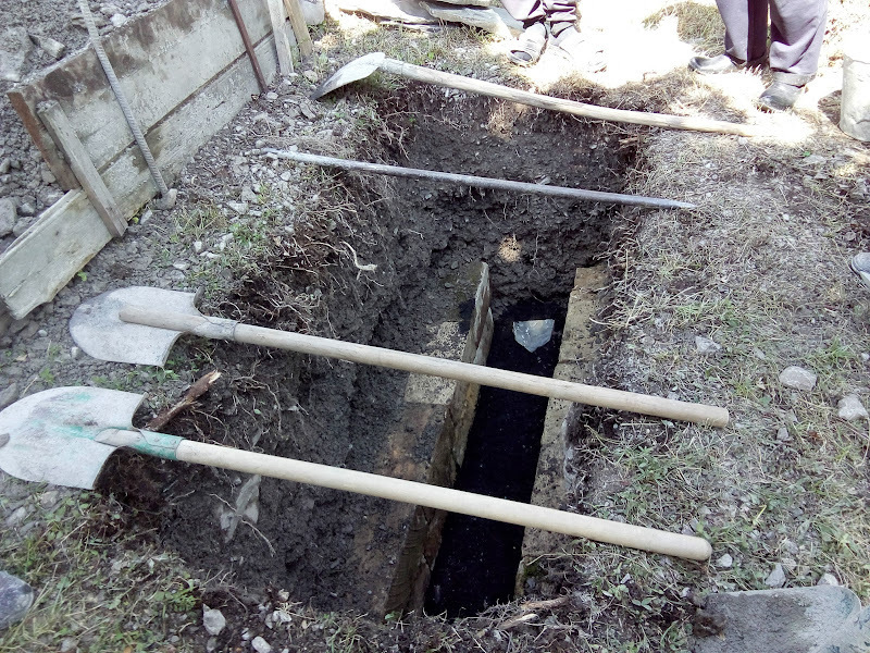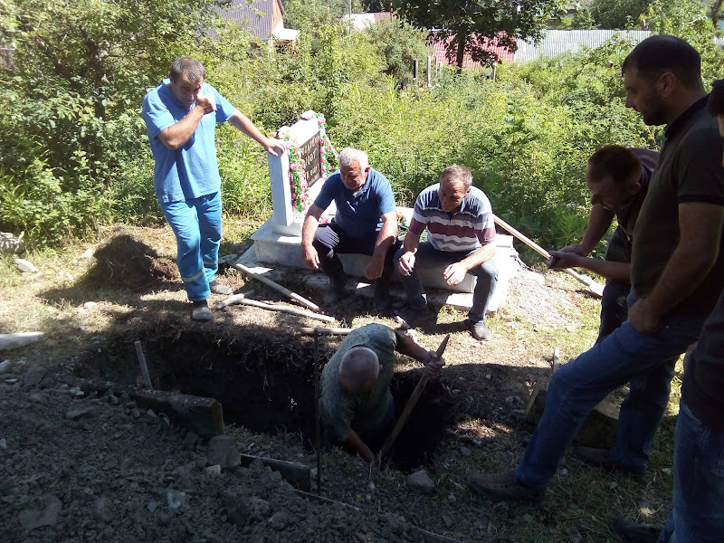 Прежде самый умелый в этом деле обозначил границы могилы, с верхней стороны по горе, в землю вкололи колышки, удерживающие пару досок, за которые вверх кидали землю. Потом, после похорон колышки убираются вместе с досками, и земля сама сыпется в могилу, конечно, ее направляют лопатами.
