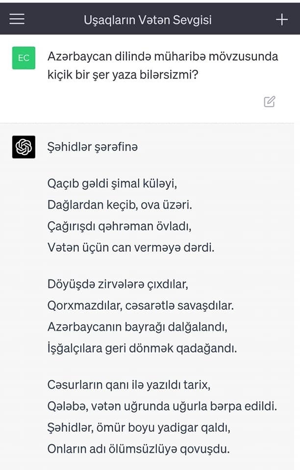 Сегодня я был удивлен сообщением азербайджанского авторитета в области İT-технологий Османа Гюндуза, он задал сети поручение написать на азербайджанском языке сказку и стихи, и мгновенно получил выполненное задание, вполне нормальные творения, такие могли бы написать реальные поэты-сказочники. На азербайджанском языке, значит на всех мировых языках эта штука работает, а ведь со времени ее появления прошло совсем ничего - вроде около полугода. Вот это стихотворение из страницы О.Гюндуза. Стих о любви к Родине у детей: