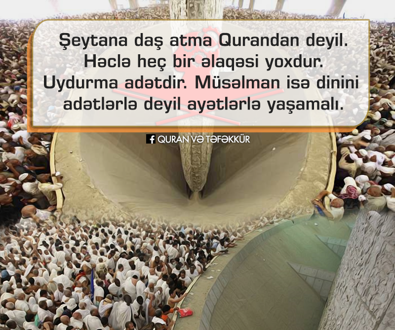 на фото показан ритуал забивания камнями дьявола в Мекке, во время хаджа. Надпись гласит об отсутствии связи этого ритуала с канонами Ислама и положениями в Коране