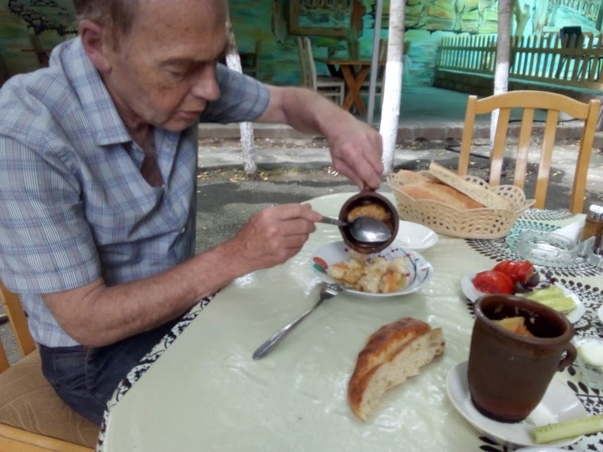 В Шеки сели кушать пити. Быть в Шеки и не откушать местное пити - нельзя, за такое могут из дома выгнать. Шофер советовал место, где вкуснее и дешевле. Про дешевле согласен, но вкус был слабый. Хотя после Баку все сойдет. Ели по правилам шекинцев: сначача из глиняного кувшина в котором приготовлен суп из баранины, курдюка и гороха, выливается в тарелку бульон и поедается с хлебом плюс сырой лук и специя - сумах.