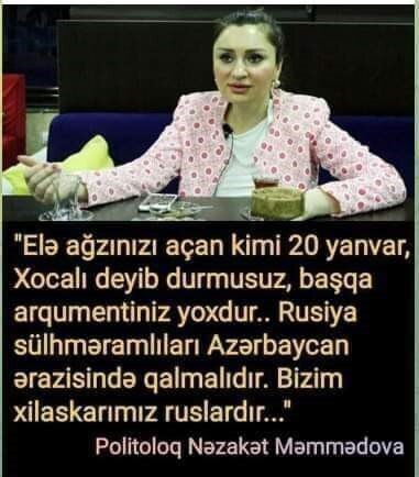 Здесь цитируется ее высказывание. Не уверен что это не фейк. Но, якобы, она сказала, что российские миротворцы должны остаться в Азербайджане. Русские наши спасители. Несмотря на трагедии в Ходжалы и 20 Января 1990 года.