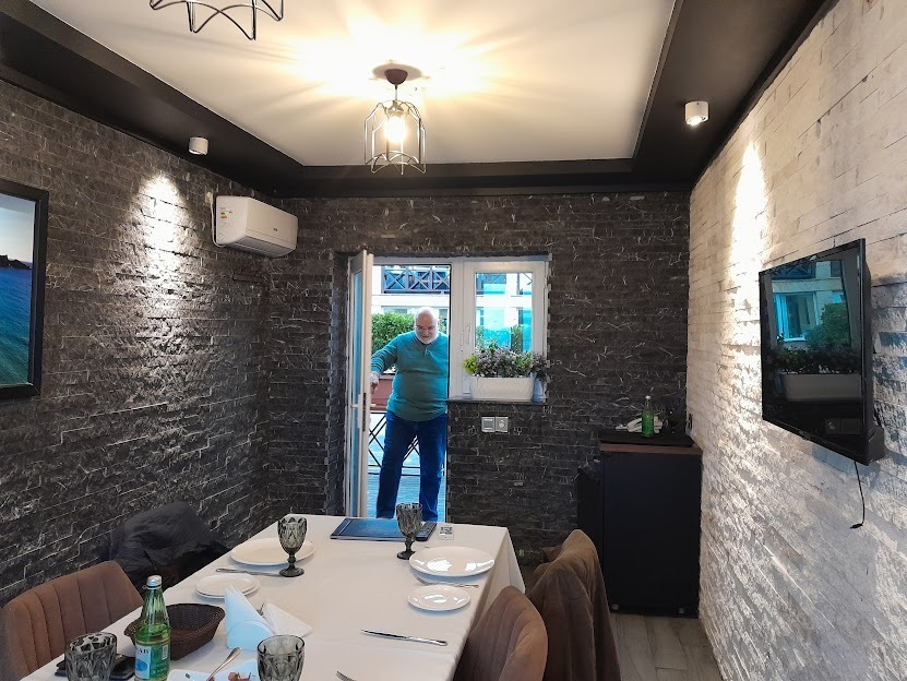 С зарубежным другом пообедали в прибрежном ресторане, в кабинете с большим окном на море. Заказали две пиалы дюшбара с сметаной+чеснок, 10 гутабов с разной начинкой, две бутылки "Бадамлы" (минеральная вода). Вышло 32 маната, то есть 18 долл. Цена средняя - не дорого и недешево, но все чисто, аккуратно, у них кухня за большим стеклом чтобы видно было как готовится. Один минус - официант входя в кабинет тихо стучался в дверь, как будто мы юная сексуальная пара и пришли для других утех. Мы даже просили его не стучать, но он в третий раз также - посмеялись, официант тоже улыбнулся, видать такой у них установлен порядок.