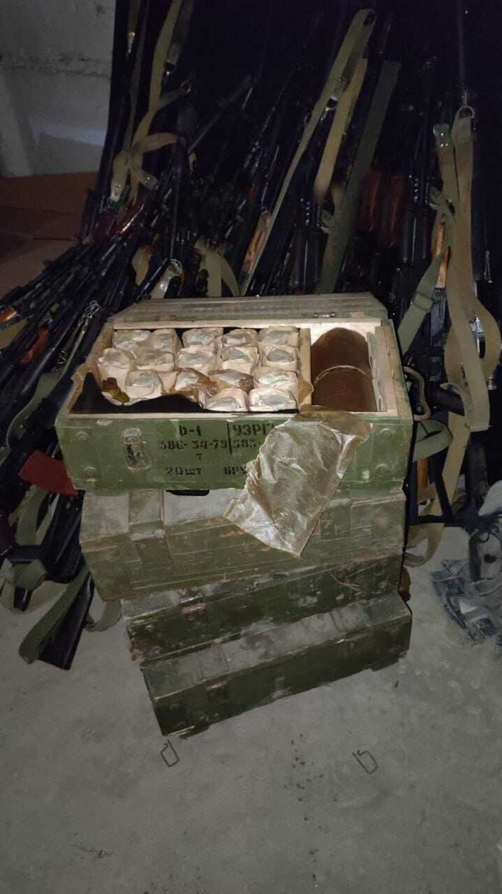 1 дрон, 1 трипот для дронов, 29 единиц автоматического оружия различных марок, 4 пистолета, 27 винтовок, 416 гранат, 113 запалов, 113 взрывчатых веществ, 1178 магазинов, 8508 снарядов, 24320 патронов различного калибра, 30 капсул, 3 оптических прицела, 10 приборов ночного видения, 50 устройств связи, 34 штыка-ножа, 57 противогазов, 4 бинокля и другие боеприпасы.