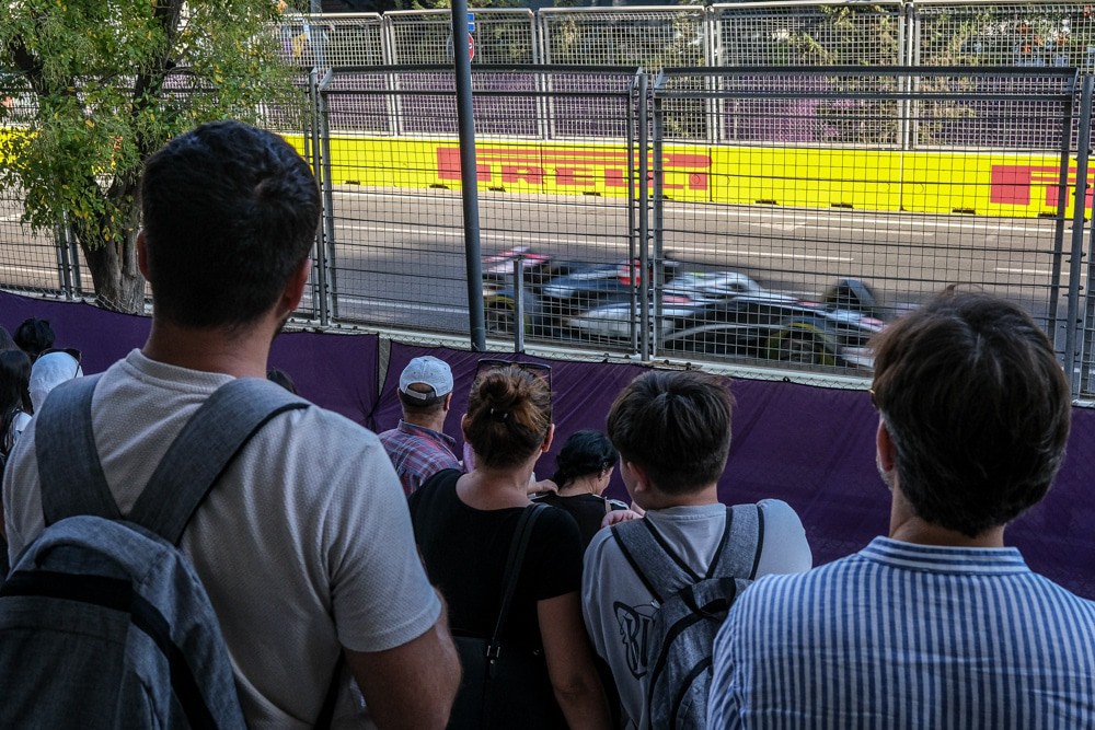 Когда жил в Баку я тоже, в дни "Формула-1", таким же партизанским способом пытался смотреть гонки. Скажу вам, что больше 10 минут стоять таким образом на улицах, выглядывая и стараясь увидеть мчащиеся болиды - невозможно. Сначала приближается грохот как от реактивного самолета, потом перед зрителями мчатся разноцветные тени - скорость так велика, что подробности в облике болидов видеть невозможно. Грохочущие тени уносятся на следующий круг и опять стоишь минут пять, ожидая следующего грохота. В пятиминутной тишине зрители-партизаны смеются, делятся удивлением и вытягивают шеи, чтобы увидеть нечто приближающееся, а потом опять - заложенные уши, промчавшиеся перед носом тени разных цветов и желание уйти с пониманием бессмысленности стояния.