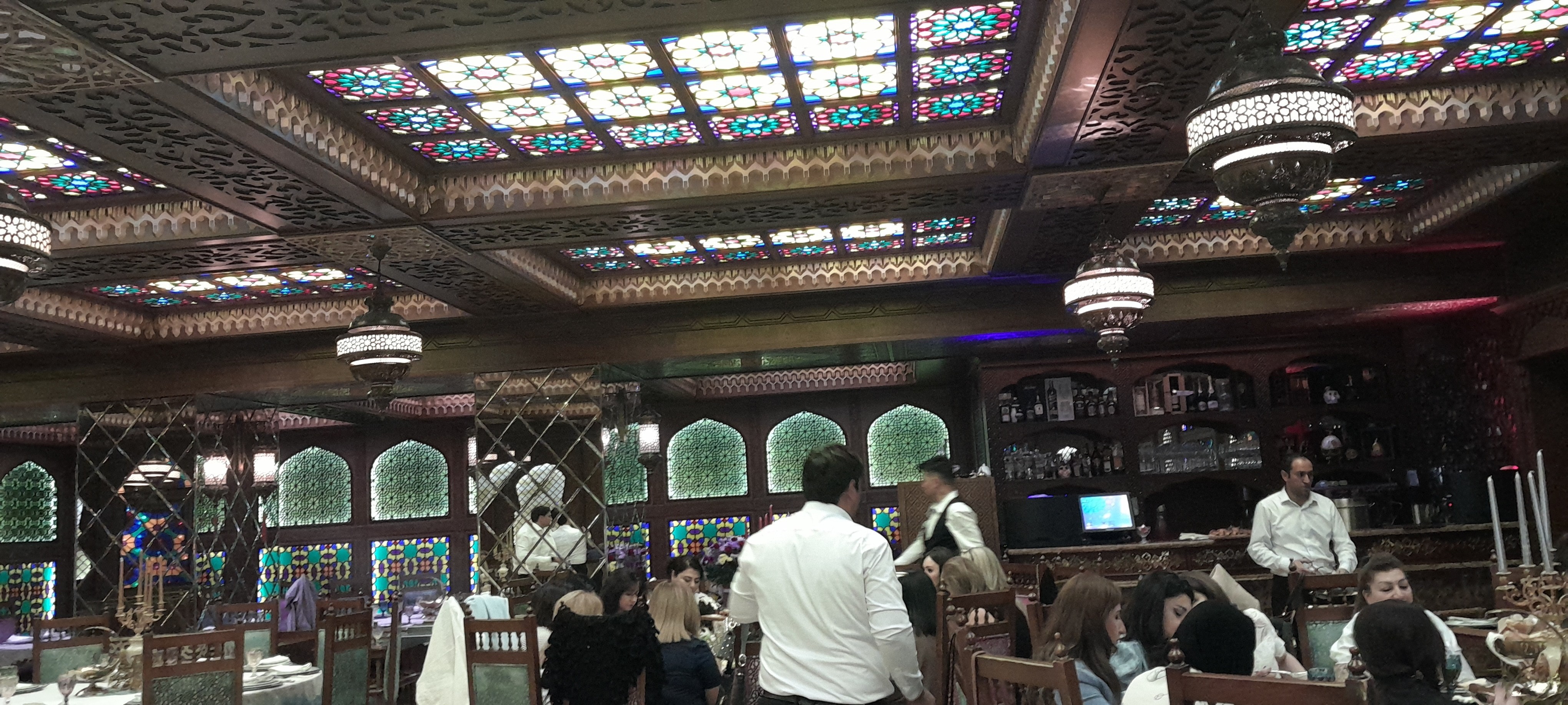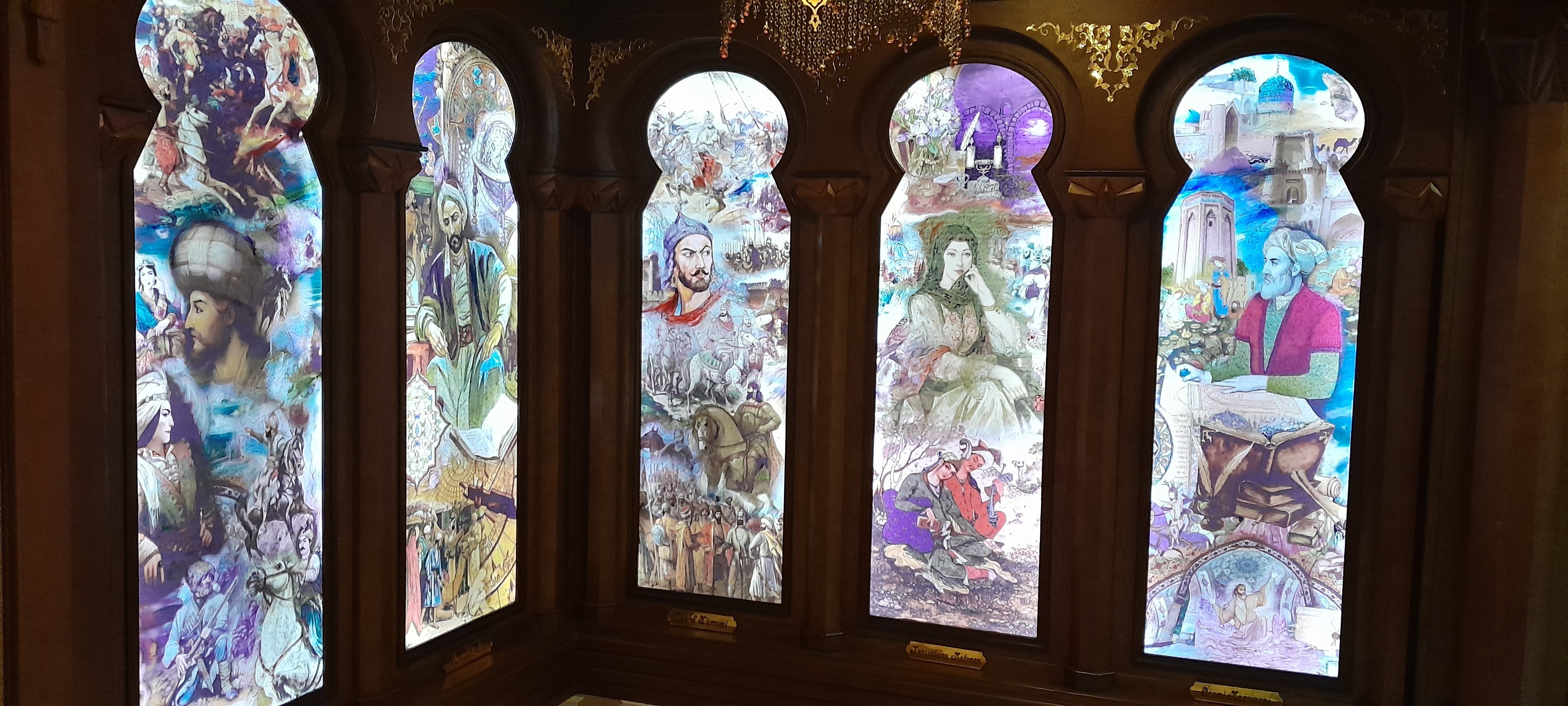 На стенах ресторана красиво установлены подсвеченные витражи, изображающие классиков азербайджанской поэзии. Под художественно выполненными портретами имена поэтов.