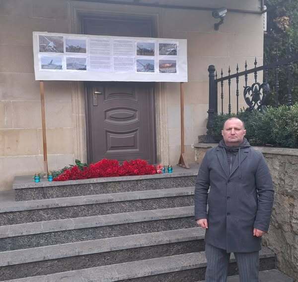 Вторая - украинцы принесли несколько букетиков к посольству Азербайджана в Киеве, узнав о сбитом самолете в небе России.