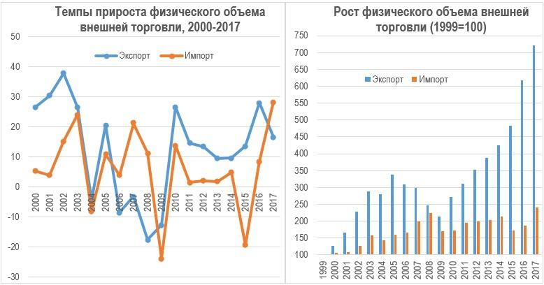 При рассмотрении реальных темпов роста оказывается, что экспорт почти всегда рос быстрее импорта в последние 18 лет, что неудивительно: импорт был изначально в 3 раза больше, то есть «работает» эффект низкой базы. На графике слева видно, что за весь рассматриваемый период, темпы роста экспорта превышали темпы роста импорта в 14 случаях и в 4 случаях – импорт рос быстрее. Причем, оказывается, что реальный объем экспорта падал уже в 2004, а также в 2006-2009 гг., то есть рост курса драма немедленно сказался и на экспорте, и на импорте. Более того, самой низкой точкой для роста экспорта стал 2008 год, а не 2009. К сожалению, вовремя эту проблему разглядеть не успели, и в 2009 году проблема с внешнеторговым балансом сказалась на макроэкономике. Но спад 2009 года произвел на экономику положительный эффект и привел к ее оздоровлению. Реальный объем экспорта в натуральном выражении сократился в 2009 году на 26% по сравнению с 2003 годом. А в 2017 году вырос по сравнению с 2009 годом на 237%. Но то, что темпы роста импорта вновь превысили таковые у экспорта, внушает некоторые опасения. Причем в реальном выражении импорт вырос еще значительнее: 29% против 17%.