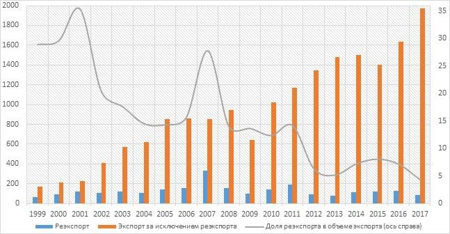 Для того, чтобы завершить тему динамики экспорта, необходимо рассмотреть и проблему реэкспорта. Согласно статистике платежного баланса, в 1999 г. реэкспорт составил 29% всего экспорта, в 2017 г. же можно ожидать, что он составит несколько более 4%.