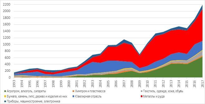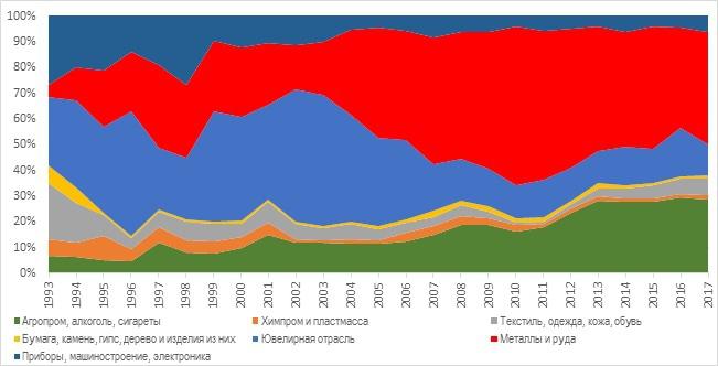 В общем-то, здесь все понятно и дополнительных разъяснений не требует. За исключением сырьевого сектора. Из приведенного графика видно, что экспорт из Армении в значительной степени сырьевой. Для сравнения, в экспорте России сырьевой сектор занимает порядка 80%, а в экспорте Армении – в среднем за 10 лет – 50%. Максимальной доли металлы и металлическая руда достигли в 2010 году – 61.4%. В 2016 году она снизилась до 39%, а в 2017 г. – превысила 43%. Таким образом, в значительной степени рост экспорта в 2017 г. был обеспечен за счет экспорта продукции горнорудной промышленности, также, как и в предыдущие годы. В 1993 г. эта отрасль начинала всего с 5% экспорта.