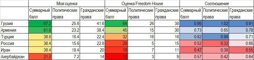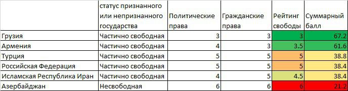 Рейтинг Freedom House остается самым авторитетным и цитируемым в этой сфере. В связи с этим чаще всего его либо некритично цитируют, либо наоборот отвергают в принципе. Я не собираюсь его ни как-то особо критиковать, ни поддерживать. Попробую оценить его достоверность в том, что касается близкого к нам региона - самого Южного Кавказа и его соседей - Ирана, России и Турции. Кстати, Freedom House также представляет уровень свободы в непризнанных государствах, но я не взялся рассматривать точность этих оценок.