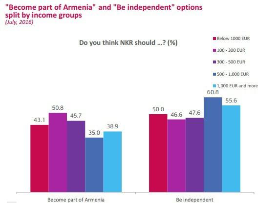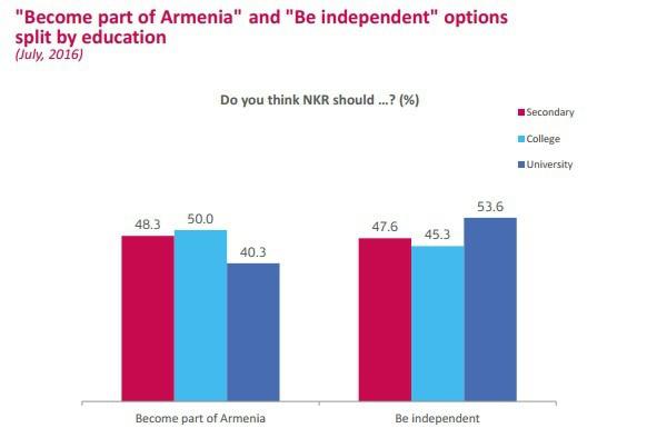 Люди с высшим образованием в июле 2016 года более склонны поддерживать независимость, по сравнению с людьми, получившими среднее образование. Разница не так сильна, как в случае с возрастом, но вполне достоверна. Кроме того, среди них больше тех, кто хотел бы статуса автономии в составе Армении (на данном графике это не заметно).