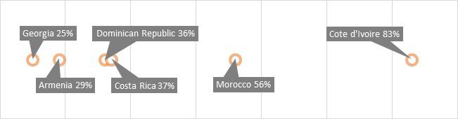 Разрыв в результатах очень велик. Так, на 2015 год Медина/Шнейдер оценивают теневую экономику Грузии в 53% от ВВП, по моей оценке, это 28%, что мне представляется близкой к реальности оценкой. В том же 2015 году было проведено социологическое исследование ОЭСР по миграции; в Грузии проводили CRRC, по результатам которого, в числе прочего, выясняли количество неформально занятых в разных странах, где под неформальной занятостью понималось отсутствие трудового контракта. В Грузии результат был – 25%, в Армении – 29%. Для сравнения, в других развивающихся странах, этот показатель был заметно выше (см. график 3).