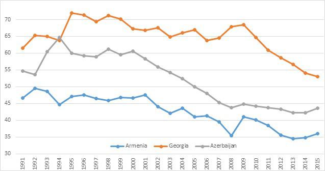 Для начала представим динамику доли теневой экономики по странам Южного Кавказа по годам (1991-2015)