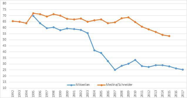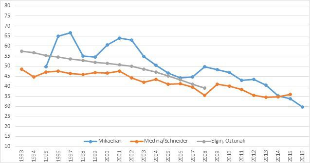 По моей оценке, видно колоссальное влияние исламской революции на экономическую среду Ирана и в частности – роль теневого сектора, последовавший за ней, что достаточно логично. Напротив, модель MIMIC, использованная другими авторами вообще не обнаруживает каких бы то ни было изменений и, к тому же, показывает гораздо более низкие результаты по сравнению с моей оценкой. Из-за гибкости модели MIMIC, она может давать сильно различающиеся результаты. Тот же Фридрих Шнейдер публиковал и другие расчеты до самой последней публикации, например, по странам ЕС и по постсоветским странам.