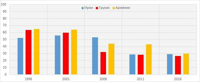 Впрочем, не буду оспаривать их результаты, поскольку здесь мой подсчет очень предварителен и, возможно, ошибочен; возможно, контроль правительства в Иране над экономической средой достаточно высок и, соответственно, доля теневого сектора там ниже. Напоследок, приведу сравнение собственного подсчета для Армении, Грузии и Ирана. К этому сравнению следует относиться осторожно, поскольку методы не идентичны из-за отсутствия данных в достаточном количестве и достаточного качества.