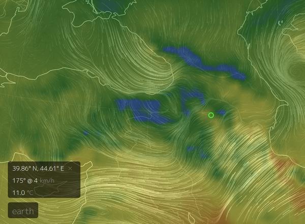 В любой текущий момент времени можно посмотреть температуру воздуха, направление и скорость ветра в любой точке мира. В частности, в Ереване или в других местах Армении. Выше - скриншот с этого ресурса. А это - ссылка https://earth.nullschool.net/ru/#current/wind/surface/level/overlay=temp/orthographic=-315.30,40.06,3000/loc=44.614,39.859