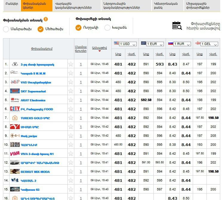 Вряд ли еще где-то существует сайт со столь подробной информацией об обменных курсах, как в Армении. Сайт rate.am предоставляет параллельно курсы по обменникам, банкам, ломбардам, а также курсы Центрального Банка по большому числу валют с архивом до 1999 года. Причем, если курс центрального банка обновляется ежедневно, то курсы обменников практически ежеминутно.