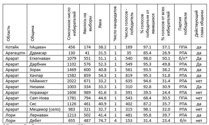 В целом, число кандидатов на общину составило 1.43. Как уже было сказано, в двух общинах было два кандидата и в обеих общинах явка превысила 60%, тогда как в остальных 12 явка была ниже 60%, а зачастую и ниже 40%. Наконец, в одной из общин (Саят-Нова, Арарат), несмотря на присутствие лишь одного кандидата, было большое число голосов против, что возможно связано с тем, что конкурент взял самоотвод до выборов. Вообще, почти везде конкуренты взяли самоотвод, кроме упомянутых двух общин. Согласно действующей системе самоуправления, в каждой общине должно быть не менее двух кандидатов, но это касается только регистрации, а не участия в голосовании. Поэтому второй кандидат часто регистрируется лишь для галочки, чтобы потом взять самоотвод, а в действительности, является представителем главы общины, иногда его сотрудником.